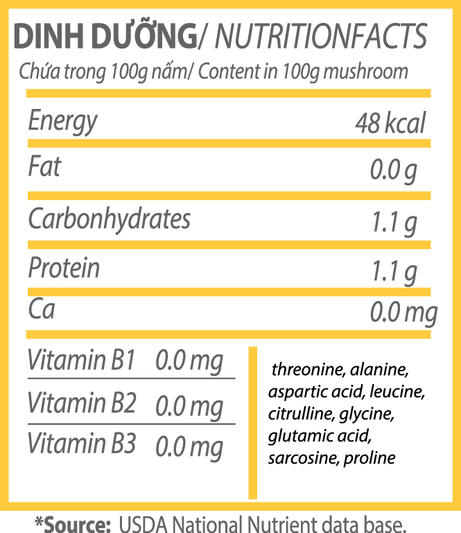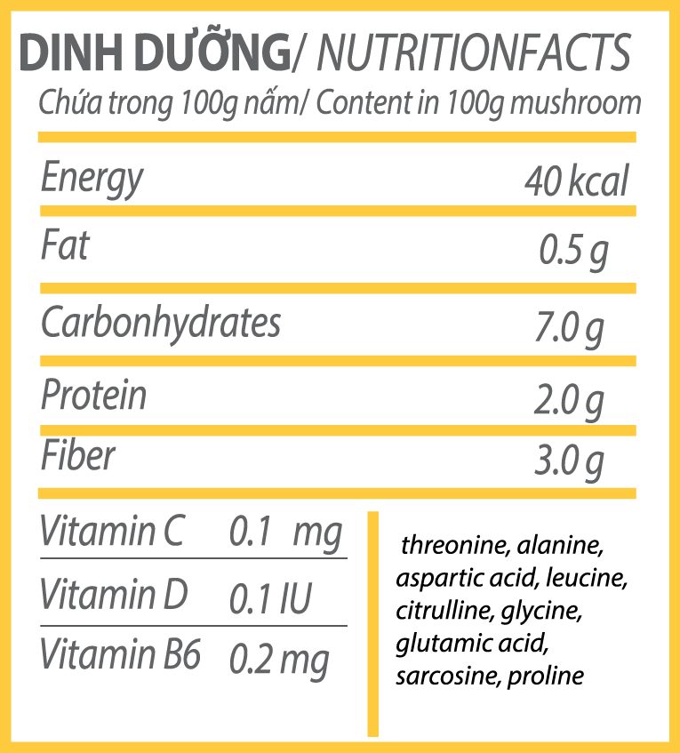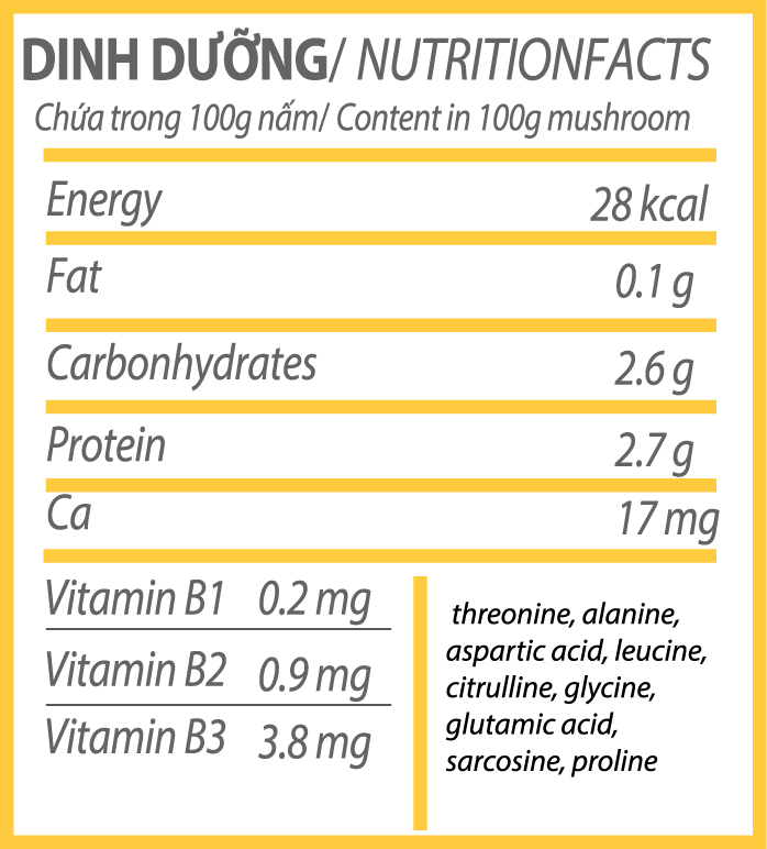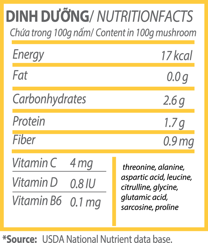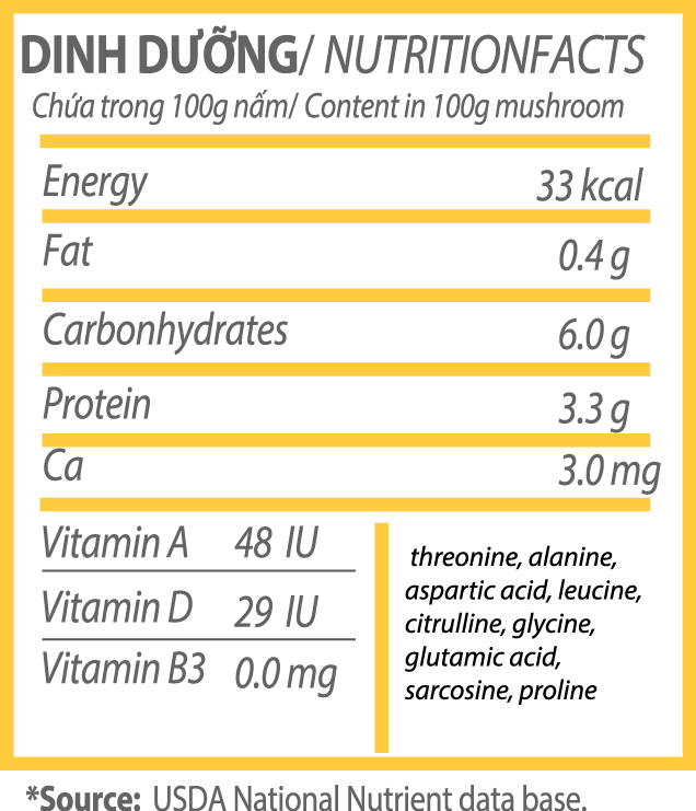 Thành phần dinh dưỡng trong nấm ăn bình quân cung cấp cho chúng ta: Protein: 25%, Lipit 8%, Gluxit 60%( trong đó đường là 52%, xơ là 8%), chất tro 7%. Ngoài ra trong nấm còn có hàm lượng các Acid amin cao (16 17 acitamin ), các vitamim ( B1, B2, B3, Vitamin C, Vitamin D ). Một số khoáng chất như Kali, Phôt pho, Natri, Magnesium có trong nấm cao hơn trong trái cây và rau củ. Giá trị năng lượng của nấm có từ 200-400kcal /100g nấm khô.